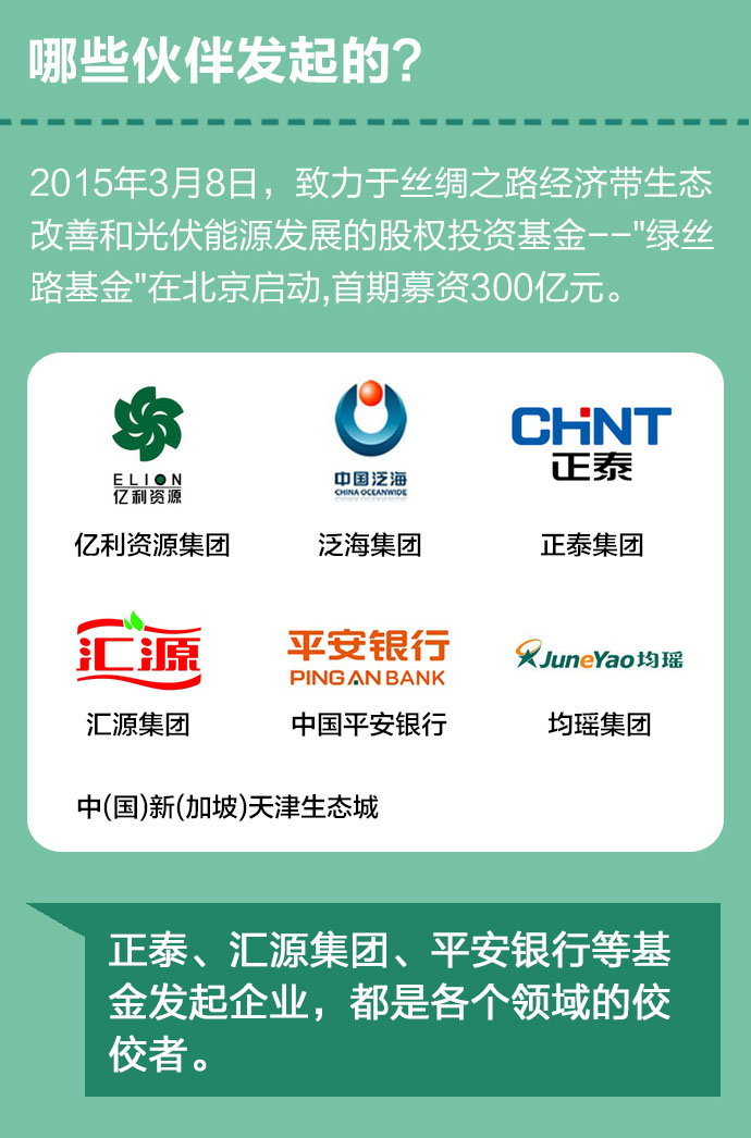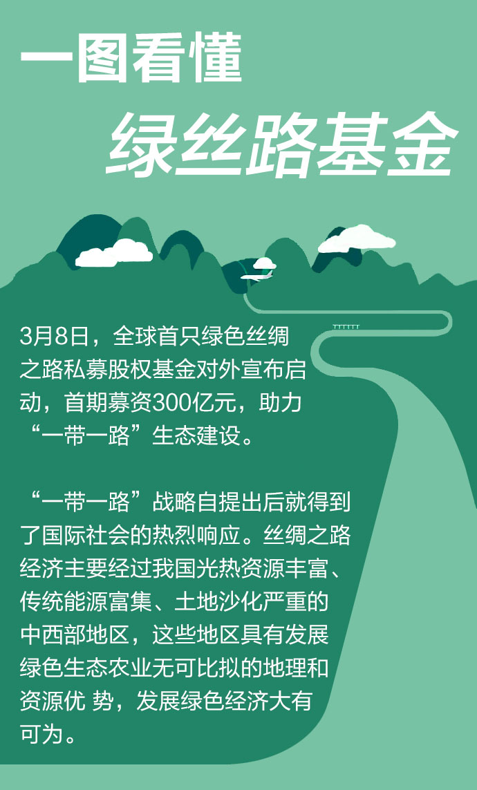 近日,首支致力于“丝绸之路经济带”生态改善和光伏能源发展的股权投资基金——“绿丝路基金”在北京启动,首期募集资金300亿元。到底什么是“绿丝路基金”?这么多资金又将用来做什么?一组图为您揭秘。