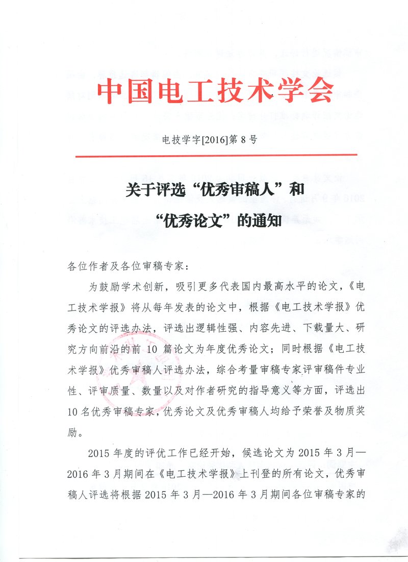 2015年度的评优工作已经开始,候选论文为2015年3月~2016年3月期间在《电工技术学报》上刊登的所有论文,优秀审稿人评选将根据2015年3月~2016年3月期间各位审稿专家的审稿情况进行评选,具体办法详见附件。