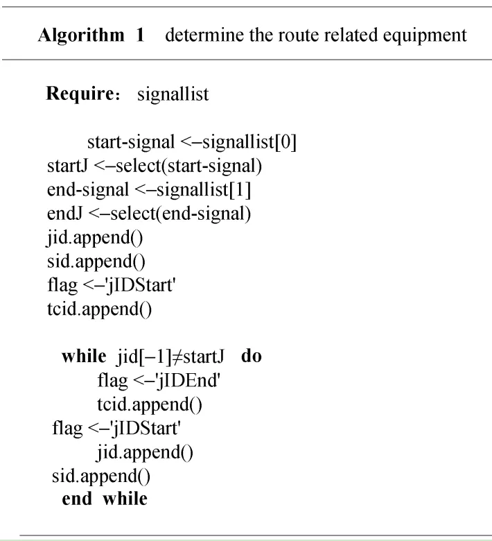 变量start-signal和end-signal代表着起始信号机和终止信号机的ID。查询jslist关系表可得到对应位置的jid[0]和jid[-1]。由于track circuit两端对应两个joint,每处joint有一架signal,所以基于joint的坐标查找和记录start-signal与end-signal之间所有与进路相关的joint及其对应的signal、track circuit的ID,得到jid、sid和tcid列表。