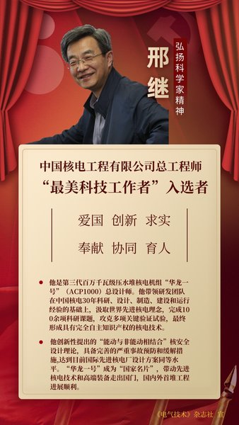 中国核电工程有限公司总工程师,“最美科技工作者”入选者!他是第三代百万千瓦级压水堆核电机组“华龙一号”(ACP1000)总设计师。他带领研发团队在中国核电30年科研、设计、制造、建设和运行经验的基础上,汲取世界先进核电理念,完成100余项科研课题,攻克多项关键验证试验,最终形成具有完全自主知识产权的核电技术。